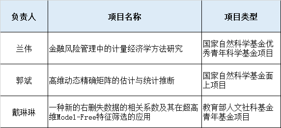 8月23日,国家自然科学基金委发布《关于2024年国家自然科学基金集中接收申请项目评审结果的通告》,中心成员兰伟教授获批优秀青年科学基金项目资助、郭斌教授获批面上项目资助。7月31日,教育部社会科学司对2024年度教育部人文社会科学研究一般项目评审结果进行了公示,中心成员戴琳琳副教授获批青年基金项目资助。更多详情如下:负责人项目名称项目类型兰伟金融风险管理中的计量经济学方法研究国家自然科学基金优秀青年科学基金项目郭斌高维动态精确矩阵的估计与统计推断国家自然科学基金面上项目戴琳琳一种新的右删失数据的相关系数及其在超高维Model-...